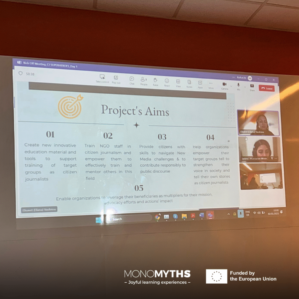The second day was dedicated to shaping these lesson plans together. Each partner contributed valuable input, ensuring the sessions and expected outcomes align with the project’s goals. The Monomyths team shared their expertise in gamification and educational design, drawing on experience from the Youth Finance Academy (YFA) project to inspire ideas for the upcoming CJ Superheroes Cardbox – a creative tool to support non-formal learning in citizen journalism.
